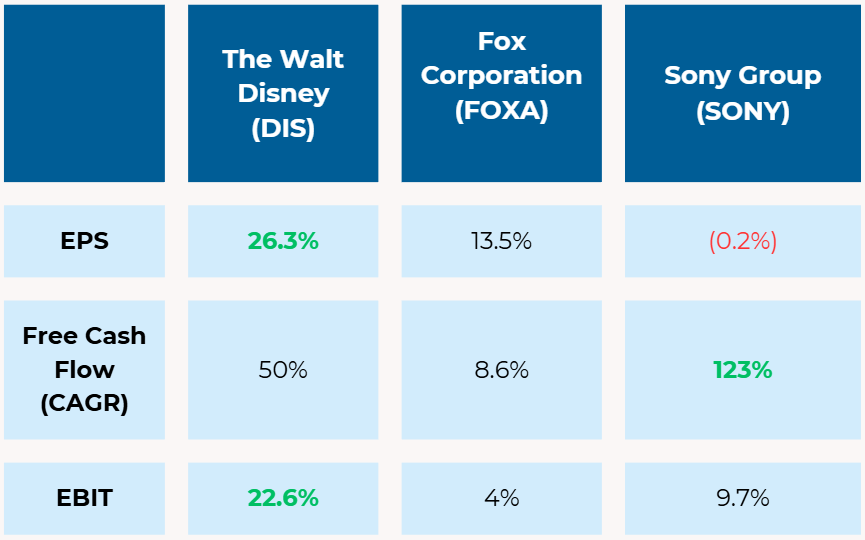 Disney (DIS) es la empresa más sólida de la comparativa por dos razones principales: