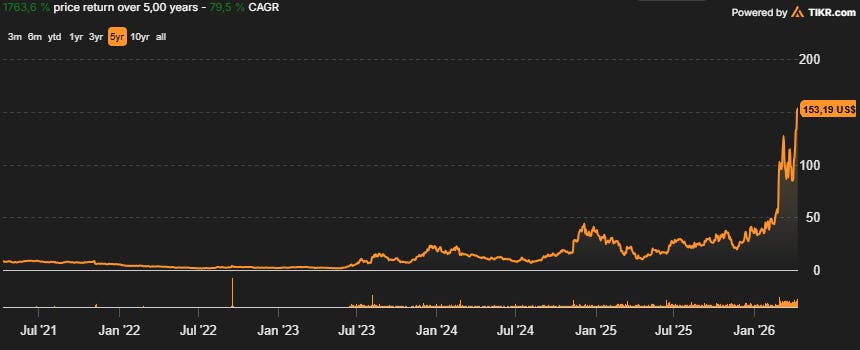 Vamos a pararnos aquí, el 13/03/25 la acción estaba a $14 y el acuerdo nos daba $23,69 como objetivo mínimo. Ahora, la acción supera los $150. ¿Qué significa? Amazon tiene un beneficio en las acciones de +$800 Millones gracias a AAOI.